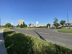 Queens Quay begins west of Bathurst Street at Stadium Road and ends at Lake Shore Boulevard East, where it continues north as Parliament Street.[3] The roadbed is built entirely on infill and is the closest road to Lake Ontario throughout the downtown core. Though once abutted by industrial and transportation uses from end to end, much of its length is now lined with recreational and residential uses. The 509 Harbourfront streetcar line now travels in a dedicated streetcar right-of-way in the median from Bay Street to Bathurst Street. The length east of Yonge Street retains some industrial uses, although this is changing with the development of residential and commercial uses.