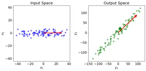 Core Idea of PLS. The loading vectors in the input and output space are drawn in red (not normalized for better visibility). When increases (independent of ), and increase.
