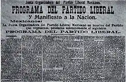 The Mexican Liberal Party (Spanish: Partido Liberal Mexicano, PLM) was founded in August 1900 when engineer Camilo Arriaga published a manifesto entitled Invitacion al Partido Liberal (Invitation to the Liberal Party). The invitation was addressed to Mexican liberals who were dissatisfied with the way the government of Porfirio Díaz was deviating from the liberal Constitution of 1857.[8] Arriaga called on Mexican liberals to form local liberal clubs, which would then send delegates to a liberal convention.[9]