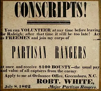 The Partisan Ranger Act drew many Southern men who were reluctant to serve in a regular army. but were eager to enroll in a partisan corps with the same pay as conventional soldiers.[6] The unintended consequences of the Partisan Ranger Act were beliefs all forms of unconventional warfare were approved, including violence toward civilians.[7]