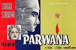 Parwana (transl. Moth) is a 1947 Indian Hindi-language drama film. It was produced by R. B. Haldia and Pratap A. Rana, and directed by J. K. Nanda. The songs were composed by Khurshid Anwar and became popular. The lyrics were written by D. N. Madhok and Naqshab. The film starred K. L. Saigal, Suraiya, Najma, K. N. Singh, Baby Khurshid and Azurie.[1] It was K. L. Saigal's last film and was released in February 1947, one month after his death in January 1947. Suraiya, who had stated in an interview that she was a big fan of Saigal's, and had already acted in two films with him.[2] The first two were Tadbir (1945) and Omar Khaiyyam (1946). Parwana was their third film together and the most famous.[2]