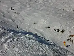 After the initial 50 metres, the slope widens to the left, allowing skiers and boarders to traverse to a less steep area and make their descent by curving around the more steep and dangerous path directly down the slope.