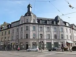 The south side of Marienplatz borders the Institute of the English Miss. On the west side is the so-called Pappschachtel (cardboard box), a makeshift building with shops and restaurants from the period between the two world wars, the 1921 created little Marienbrunnen and the historically protected Confetti-Haus.[4]