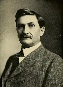 On December 16, 1901, President Theodore Roosevelt nominated Garrett to the post of collector of customs in El Paso.[52] He also became one of President Roosevelt's three "White House Gunfighters" (Bat Masterson and Ben Daniels being the others).[53] Despite public outcry over his appointment, Garrett was confirmed by the U.S. Senate on January 2, 1902.[54] Garrett's tenure as El Paso's collector of customs was stormy from the start. On May 8, 1903, he got into a public fistfight with an employee named George Gaither. The following morning, both Garrett and Gaither paid five-dollar fines for disturbing the peace.[55] Continued complaints about Garrett's alleged incompetence were sent to Washington.[56] Through it all, President Roosevelt stood by Garrett. As a show of his support, Roosevelt invited Garrett to attend a Rough Riders reunion being held in San Antonio during April 1905. Since Garrett had not been a member of that regiment, Roosevelt's invitation was taken as a snub at those critics who wanted Garrett replaced from his post. Garrett brought a guest of his own to the event named Tom Powers. Garrett introduced Powers to the president as "a prominent Texas cattleman." Garrett and Powers posed for two photographs with Roosevelt, first standing with him in a group and later seated with Roosevelt at dinner.[57][58] Garrett's enemies obtained copies of the photos and sent them to Roosevelt, informing the president that instead of being the "cattleman" that Garrett claimed, Powers was, in fact, the owner of a "notorious dive" in El Paso called the Coney Island Saloon. That was the final straw for Roosevelt, who replaced Garrett with a new collector of customs on January 2, 1906.[59]