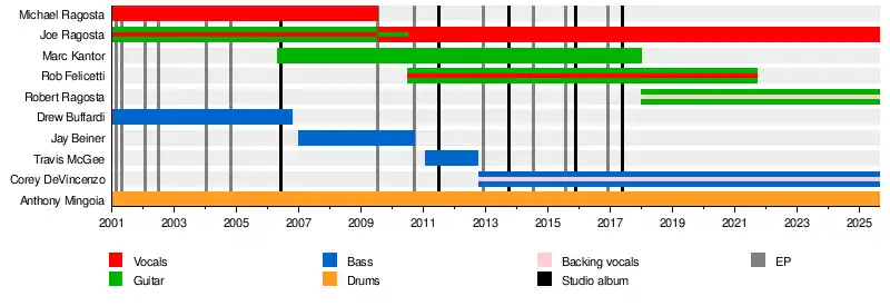 - Joe Ragosta – vocals (2001–2009), lead vocals (2009-present), guitar (2001–2010)