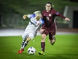 Hmírová is also a member of the Slovakia women's national football team.[13] By the time of her transfer to Spain in July 2022, she had accumulated 94 appearances for Slovakia, scoring 18 goals.[8] In October 2022, Hmírová made her 100th national team appearance, having scored 19 goals in the process.[9]