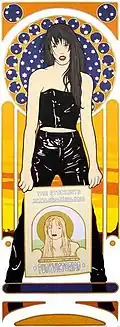 His images are often derived from pictures of film and singing "stars" in magazines, and reworked into a new context. His style references pop art and Alfons Mucha.[3] The incorporation of modern symbols poses an ambiguity as to the amount of irony present, though the artist has claimed that he does not intend this.[18] Possibly his best-known work is a painting of the singer Madonna. The elements mentioned are clearly visible, with small dumbbells around the border, for example Madonna, contrasting with Art Nouveau curves and languidity.
