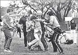 The East Town Lake Citizens Neighborhood Association, with leaders Paul Hernandez and Edward Rendon Sr. organized noisy, but peaceful protests calling for an end to the races. They were joined by El Centro Chicano and the Brown Berets.[7] In 1978, when police broke up one protest Hernandez was beaten up badly. A widely published photograph shows Hernandez surrounded by plainclothes and uniformed law enforcement wielding billy clubs. Afterward a police officer was suspended for using excessive force and the Austin City Council abolished the drag boat races. The summer of 1978 was the last summer the boat races were held on Town Lake.[3]