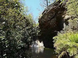 He made use of the surrounding outlooks and natural vegetation and he did use large native trees—such as the Illawarra flame trees and coastal cypress pine at "Gleniffer Brae"—when and where it suited his design. In the garden of "Mahratta", he mixed native trees with exotics.[11] At "Everglades", he created a small waterfall and "grotto pool" of natural appearance—clearly influenced by the natural watercourses of the Blue Mountains—and the garden has a lookout overlooking Gordon Falls and the Jamison Valley[39][3][40] Similarly, at "Leuralla", the garden overlooks the Jamison Valley. At "Gleniffer Brae", the garden framed views of nearby Mount Keira and at Mt Keira Scout Camp, he made advantage of distant views to the ocean.[41] However, Sorensen planned his gardens so that plantings screened views and other features, which were gradually revealed only by moving through the garden space.[3]