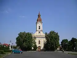 The church was completed in the 1790s.[17] It is notable for its murals, including images of the church Esztergom Basilica on each side of the triumphal arch, painted in 1843. The single-aisle nave of the church is vaulted with two fields of Prussian vaults. A spiral staircase in the southern part of the church leads to the three-axis matroneum above, which contains the organ. The communion table, sanctuary, and celebrant pews are located in the northern part of the church. The room above the sacristy holds additional seats, once reserved for patrons and nobles in past centuries.
