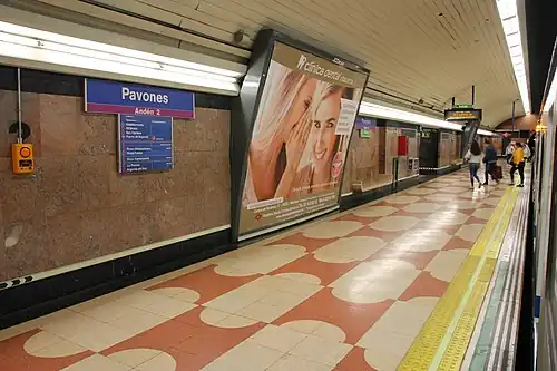 Pavones [paˈβones] is a station on Line 9 of the Madrid Metro, serving the Pavones barrio. It is located in fare Zone A.[1]