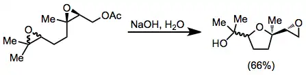 Intermolecular nucleophilic trapping of a single epoxide isomer is difficult, as reaction of the epoxy alcohol with the electrophile is typically faster than migration. However, intramolecular electrophies are often effective for trapping a single epoxide isomer. For instance, a second nearby epoxide in the starting material of equation (9) is trapped by a single epoxide isomer, leading to a tetrahydrofuran.[12]