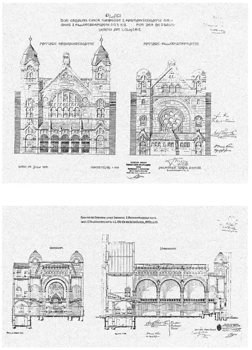 The synagogue was designed and constructed by the architect Ignaz Reiser and dedicated on 28 September 1913. It was built to commemorate the 80th birthday of Franz Joseph I. The building was financed by Adolf Schramek (1845–1915) [2][3] who signed the contract with the builder in 1910. Originally from Leipnik, Moravia, Schramek became one of Vienna's most successful coal merchants.
