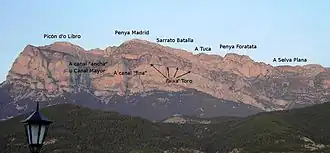 The Peña Montañesa (Aragonese: Penya Montanyesa) is a conspicuous rocky mountainous outcrop of the Pre-Pyrenees. It is located east of the valley of the Cinca, in the Sobrarbe comarca, Aragon, Spain.[1] The ridge's highest summit is 2295 m high. The village of Laspuña is located at the feet of the mountain.