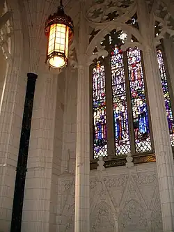 The Peace Tower was designed by architect John A. Pearson not only to stand as an architectural feature and landmark, but also to function as a memorial to Canadians who had given their lives during the Great War.[7] It thus houses the Memorial Chamber, a vaulted 7.3 m by 7.3 m (24 ft by 24 ft) room directly above the porte-cochere,[1] with stained glass windows and various other features illustrating Canada's war record, such as the brass plates made from spent shell casings found on battlefields that were inlaid into the floor, and bore the name of each of Canada's major conflicts during the First World War. Stone that architect John Pearson personally collected from the main European battlefields where Canadians were killed is included in the floors and walls. Pearson described the room, also called the Memorial Chapel, as a "sacred grove in the middle of the forest."[8]