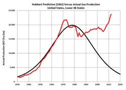In 1971, Hubbert revised his peak gas estimate based on updated reserve information. He revised his estimated ultimate recovery upward to 1,075 trillion cubic feet (30,400 km3) for the lower 48 states only, and predicted: "For natural gas, the peak of production will probably be reached between 1975 and 1980."[30] Gas production for the lower 48 states did peak in 1979, and declined for several years, but rose again, and once more Hubbert's assumed EUR of 1,075×1012 cu ft (30,400 km3) proved to be too low, as actual lower 48 state production from 1936 through 2012 has already exceeded 1,265×1012 cu ft (35,800 km3), 18% higher than the estimated EUR of 1,075.[31]