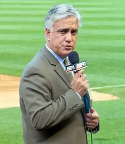 Gomez gained much experience during this seven-year period as a newspaper writer. His work in Sacramento, San Jose and later as a national baseball writer and general sports columnist for The Arizona Republic in Phoenix from 1997 to 2003 led to ESPN's hiring of him in 2003 to work at SportsCenter.[6] Gomez specialized in baseball reporting for ESPN[8] and followed Barry Bonds for the better part of three seasons as Bonds pursued Hank Aaron for the all-time MLB home run record.[1] Gomez's favorite event that he covered was Game 6 of the 2003 National League Championship Series, when Chicago Cubs fan Steve Bartman attempted to catch a foul ball against the Miami Marlins, who went on to score eight times in the inning.[7] In 2016, Gomez went to Cuba to cover an exhibition game between the Tampa Bay Rays and the Cuba national team, the first visit by an MLB club in almost two decades.[9] He also appeared on Baseball Tonight and other studio shows.[3]