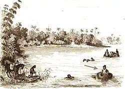 It also served to convey those who could not swim, or would not. In the colonial era, Spanish military commanders, though they knew how to swim, held it was beneath their dignity to strip in front of the common soldiery, and were conveyed by pelota; "scorning the assistance of another person, they impel forwards by two forked boughs for oars".[33] The Rodrigues Ferreira expedition to the Mato Grosso (c. 1785) drew indigenous people taking their children across in pelotas, propelled by pairs of women.[34]