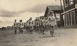 The exact number of prisoners and deaths in Clevelândia was a constant concern in the press and historiography.[58] The lowest number used by Pinheiro and Samis is 946, provided by the report Journey to the Cleveland Colonial Nucleus, presented by Oldemar Murtinho, director of the Secretariat of State Section to the Minister of Agriculture in 1926. The report identified 262 escapes and 491 deaths. Romani quantified around 1,200 exiles, based on the "classification drawn up by the police in the sending lists", and noted that there are many known cases of prisoners missing from the lists. The highest estimate was 1,630 men, according to Manoelzinho dos Santos.[59][60] Security was provided by a detachment of the 26th Battalion of Caçadores,[61] initially comprising 26 soldiers and later reinforced by another 120 when escapes became frequent.[52]