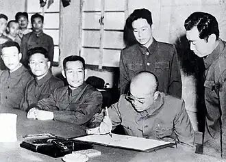 From 1942 to 1945, Peng's role in the war was mostly political, and he supported Mao very closely.[31] In June 1944, Peng was part of a team that held conferences with American military personnel who visited Yan'an as part of the Dixie Mission, briefing the Americans about the military situation in Japanese-occupied China.[35]