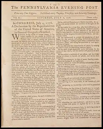 2. ^ "First Newspaper Printing of the Declaration". Museum of the American Revolution. Retrieved 31 March 2013.