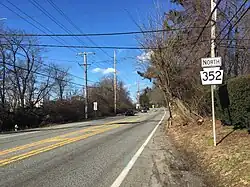 Pennsylvania Route 352 (PA 352) is a 19-mile (31 km) north–south route that runs from U.S. Route 13 Business (US 13 Bus.) in Chester, Delaware County, north to US 30 in Frazer, Chester County. The route passes through suburban areas of Delaware and Chester counties west of Philadelphia, serving Parkside, Brookhaven, Elwyn, Lima, Gradyville, and Goshenville. PA 352 is a four- to five-lane road between Brookhaven and US 1, otherwise it is generally a two-lane road. The route intersects Interstate 95 (I-95) in Chester and US 1 near Lima at interchanges. PA 352 was first designated by 1928 to run between its current termini. A portion of the route between Brookhaven and US 1 was realigned to a straighter alignment in the 1950s. By 1980, PA 352 was realigned to a short concurrency with PA 3 to avoid intersecting it at a sharp angle.