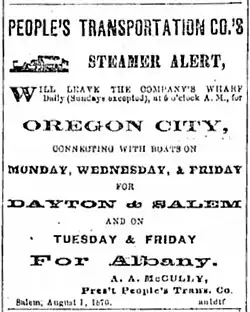 In 1867, the People's Transportation Company advertised freight service to McMinnville at a rate of $7.00 per ton.[36] Also in September 1867, the steamers Enterprise and Echo were reported to be able to make regular trips to Albany because navigation obstacles in the river had been removed.[37] The P.T. Company was building a new shallow-draft steamer at Canemah in September 1867.[37] Echo was reported to have beaten the stage coach a good part of the way to Salem.[37]