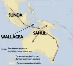 Around 70,000 years ago, insular Southeast Asia was not the archipelago it is today, but a continental shelf, the Sunda plateau, a peninsular extension of the Asian continent. Australia's shoreline extended much further into the Timor Sea.[2] Australia and New Guinea, linked by a land bridge across the Arafura Sea, the Gulf of Carpentaria, and Torres Strait, formed a single landmass called Sahul, which also encompassed Tasmania.[3][4] Between Sunda and Sahul lay an archipelago that geographers call Wallacea, the eastern part of Indonesia. At that time, it was possible to travel from Sunda to Sahul without having to cross more than 100 km of sea.