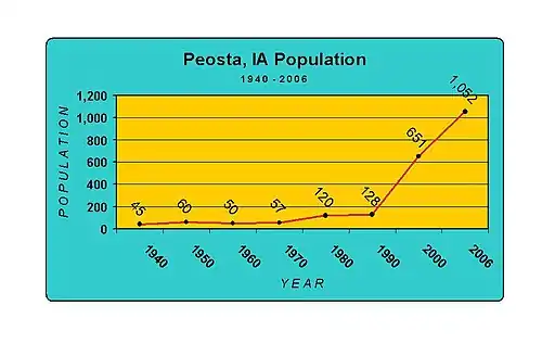 For most of its history, and even as recently as 1990, Peosta was a quiet rural town of approximately 100 people. A post office opened in Peosta in 1858.[6] The groundwork for later growth was laid in the 1960s, when the new four-lane U.S. Route 20 opened along the city's southern edge, providing quick access to Dubuque. The city was also aided by the opening of Northeast Iowa Technical Institute (later NICC) in 1979. However, it was only when the city's industrial park began to flourish in the 1990s that the population began to soar. Peosta grew from 128 people in 1990 to over 1,300 today, and it continues to climb rapidly. This 1000% growth in 20 years has helped attract new businesses and services to Peosta as well. The city now boasts two elementary schools, its own community center, hotel, church, industrial park and expanding neighborhoods.