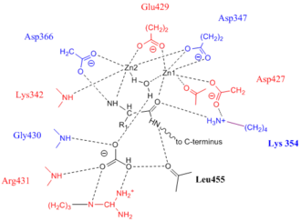 - ^ Sträter N, Sun L, Kantrowitz ER, Lipscomb WN (September 1999). "A bicarbonate ion as a general base in the mechanism of peptide hydrolysis by dizinc leucine aminopeptidase". Proceedings of the National Academy of Sciences of the United States of America. 96 (20): 11151–5. Bibcode:1999PNAS...9611151S. doi:10.1073/pnas.96.20.11151. PMC 18002. PMID 10500145.