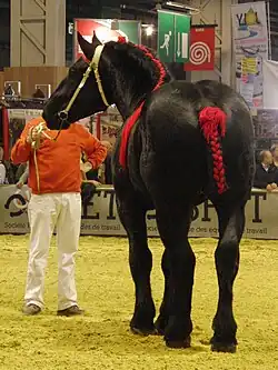 In 1966, the French stud book was changed to include draft types from other areas of France that were closely related to the Percheron—including the horses of Berrichon, Nivernais, Marne, Augeron, Bourbonnais, Loire and Saône-et-Loire.[1] French Percherons were also hit hard by the advent of mechanization, and between 1970 and 1990 focus was placed on breeding horses of greater mass for the meat market. The largest and heaviest stallions were selected for breeding.[27][28] Beginning at the 1989 World Percheron Congress, French breeders realized that they needed a lighter breed for tourism, export to Japan for draft work, and other markets.[27][29] In 1993, a trend of importing American stallions to France was started with the black stallion Silver Shadows Sheik.[30] This stallion and others were used to create a more elegant, smaller and sleeker look in the French Percheron, while still retaining the traditional bone and foot structure. All the imported stallions were black, reviving the popularity of black Percherons in France.[27] French breeders continue to import American-bred Percheron stallions in order to produce lighter foals, moving away from the heavier meat-type horses of the late 20th century.[31] Also in 1993, the Société Hippique Percheronne anticipated the increasing tourist and exportation markets by prohibiting docking, which was not prohibited for other draft breeds until 1996.[32] This was partly at the request of the Germans,[33] and partly due to the influence of magazines such as Cheval.[34]