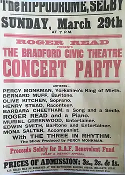 After the war, he returned to the bank in Bradford and continued as a compere and comedian. In 1935, he joined the Bradford Civic Theatre, where he performed in many productions, usually in comic roles. Many were plays by JB Priestley, a man of letters, lifelong friend, and the most celebrated Bradfordian of that generation. [6]