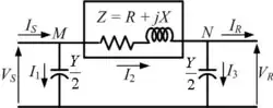 Like the medium transmission line, the long line can also be approximated into an equivalent Π representation. In the Π-equivalent of a long transmission line, the series impedance is denoted by Z′ while the shunt admittance is denoted by Y′.