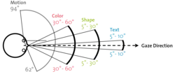 Most obvious changes are “motion”, which can be perceived over the whole spectrum of the FOV. In a smaller angle, change in color is also quite well perceivable (see figure). In contrast, perceiving shapes and reading text requires very dedicated attention of the pupil. However, when being very focused on a dedicated task, rough changes in shapes are still perceivable in a peripheral way.[10] Even in the field of Human-Computer Interaction, there have been investigations on this visual “peripheral channel”, such as peripheral color perception with eyeglasses.[11] Furthermore, researchers proposed to additionally utilize an eye tracker for a peripheral head-mounted display, in order to improve user experience.[5] There has also been investigations on which display positions are most suitable.[8] It has been found out that notifications presented at the middle and bottom areas of our human vision is more noticeable. However, top and middle positions are less distracting and more comfortable and preferred by the users. Among all the positions, the middle right position was found to strike the best balance between noticeability, comfort, and distraction.