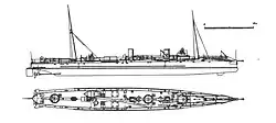 The resulting Pernov-class torpedo boat had a displacement of 120 tonnes (120 long tons), a length of 42 m (137 ft 10 in), beam of 4.5 m (14 ft 9 in), and draught of 2.06 m (6 ft 9 in).[4] The boat received its power from two du Temple boilers, which were more reliable than the locomotive boilers used on earlier designs, and two vertical triple expansion steam engines, which provided 2,000 horsepower (1,500 kW) to the two propeller shafts.[4][5][6] The torpedo boat carried 16 tons of coal.[4] This gave it a top speed of 26 knots (48 km/h),[4] and a range of 550 nautical miles (1,020 km) at a speed of 10 knots (19 km/h).[5] As armament, the boat had three 381 mm (15.0 in) deck torpedo tubes and two 37 mm (1.46 in) guns.[4][5] The total crew was 24, consisting of two officers and 22 sailors.[6]