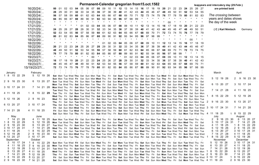 The following calendar works for any date from 15 October 1582 onwards, but only for Gregorian calendar dates.