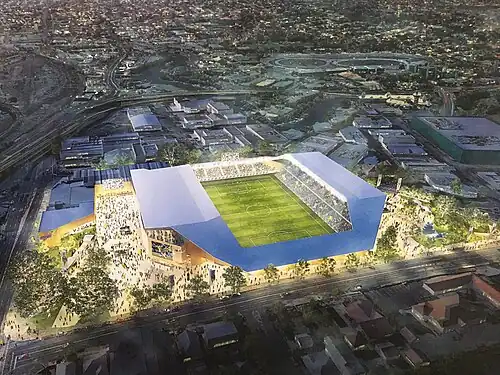 As part of the Strikers' aborted bid for an A-League licence in 2018,[5] the club produced plans for a complete rebuild of the facility, which would have seen the current Bill Waddell stand demolished and the pitched moved to the east[6] to accommodate a 15,694-seat boutique stadium.[7]
