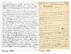 The handwriting in the manuscript of Grant's Memoirs and that of his friend Mark Twain, showing that Twain was neither the author nor took dictation of Grant's Memoirs.