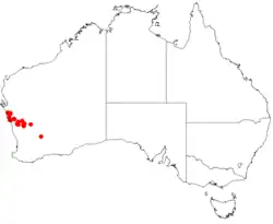 This geebung usually grows in Acacia woodland and occurs from near the Murchison River to near Perenjori, in the Avon Wheatbelt, Geraldton Sandplains and Yalgoo biogeographic regions.[3][5]