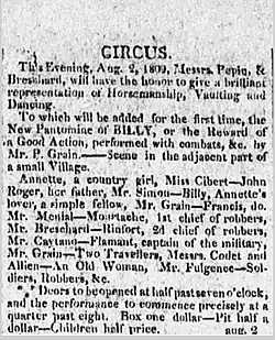 Born in France,[1] Grain was originally a performer and playwright with the Circus of Pépin and Breschard,[2] a company which toured the United States from 1807 until 1815.[3] On August 2, 1809, Pépin and Breschard presented his play Billy, or the Reward of a Good Action in New York City. This "New Pantomime" included "combats" on horseback, making it an early example of hippodrama. Grain was cast as the title character. His billing as "Mr. Grain" can be seen in other advertisements for the company's 1809 season.[4]