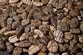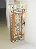 After the Postoj, Kalmus participated at many art exhibitions in Slovakia and abroad.[5] Kalmous considers creating art to be his lifestyle.[6] His work reflects the public obsession with consumerism as well politics, death, religion, sports.[7] He has several long-running projects, including the cycles Partitúry (Scores) and Korózne grafiky (Corrosive Prints). Perhaps his well-known long-term project has consisted of wrapping a wire around at least one stone every day between 1998 and 2022, representing the 70 000 Jews deported from Slovakia by the fascist Slovak Republic during the World War II.[3] A Peter Kalous' Holocaust monument, consisting of four glass tubes filled with the wire-wrapped stones, was first uncovered in 2016 by the President of Slovakia Andrej Kiska. It is located in a renovated synagogue in the town of Lučenec.[8]