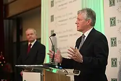 In September 2015, Robinson again stood aside to allow Arlene Foster to become acting First Minister after his bid to adjourn the assembly was rejected. His action was a response to a murder for which a member of Sinn Féin, a party in the Northern Ireland Executive, had been questioned.[6] He resumed his duties on 20 October 2015.[7] On 19 November 2015, he announced that he would be stepping down as First Minister and as leader of the DUP.[8] Robinson subsequently stepped down as First Minister on 11 January 2016 and has now fully retired from frontline politics.[9] He is currently the longest-serving Northern Irish First Minister since the Good Friday Agreement of 1998.
