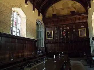 Old Court lies beyond the Chapel cloisters. To the south of the court is the dining hall, the only College building that survives from the 13th century and the oldest collegiate building in all of Cambridge. Between 1866 and 1870, the hall was restored by the architect George Gilbert Scott, Jr. Under Scott, the timber roof was repaired and two old parlours merged to form a new Combination Room. The stained glass windows were also replaced with Pre-Raphaelite pieces by William Morris, Ford Madox Brown and Edward Burne-Jones.[10] The fireplace (originally built in 1618) was restored with tiles by Morris, including depictions of St Peter and Hugo de Balsham.[26] The hall was extensively renovated in 2006-7.