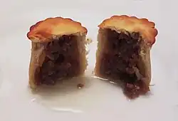 The size and shape of a spool of sewing thread, these little meat pies are a golden brown, crispy pastry with a moist, sweet inside, composed of lean roast mutton, sheep suet, brown and white sugar, lemon peel, salt, and pepper. They can be eaten as an hors d'oeuvre, with a salad or as a dessert. They are cooked in patisseries all over the town. According to legend, Lord Clive or his cook invented the recipe using spices from India and taught it to the pastry makers of Pézenas when they were staying at the Château de Larzac in 1768. The same filling is also used in Tourte de Pézenas, made with flaky pastry.[2]