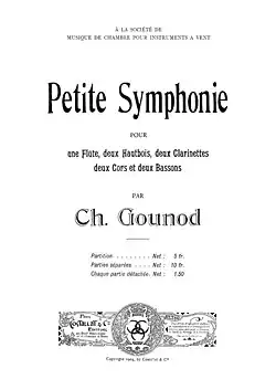Gounod had composed two symphonies for full orchestra in the 1850s but had since then generally concentrated on opera, songs, and religious music.[1] At the request of a Parisian wind ensemble, the Société de musique de chambre pour instruments à vent, led by the flautist Paul Taffanel, he wrote a nonet for flute and pairs of oboes, clarinets, horns and bassoons. The work was first given at the Salle Pleyel in Paris on 30 April 1885.[2] The score was not published until 1904.[1]