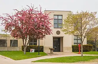 The Petoskey Public Works Utility Building is a two-story concrete Moderne structure with metal-framed windows. A single-story addition extends to one side at the rear of the building. The entry bay protrudes forward. The exterior walls are grooved, referencing the fluting seen in classical piers.[2]