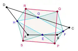 | Petr–Douglas–Neumann theorem as applied to a self-intersecting quadrilateral A0 = ABCD. A1 = EFGH is constructed using apex angle π/2 and A2 = PQRS with apex angle π. |