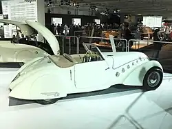 Other models appearing on the “normal” wheelbase at the 1936 show included a Grand-luxe berline with a sliding steel sun roof, a 4/5 seater 2-door soft-top cabriolet priced in October 1936 at 30,900 francs, a 5/6-seater "coach" (elegant two-door saloon) priced at 29,900 francs, a 2/3-seater roadster at 27,900 francs and a "coupé transformable Éclipse", which was a steel-roofed convertible, priced at 34,900 francs.[4]