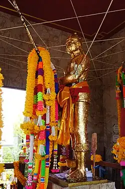 Phan Thai Norasing (Thai: พันท้ายนรสิงห์) is a legendary figure mentioned in some later editions of the royal chronicles of Ayutthaya. He is described as a coxswain of King Sanphet VIII's royal barge in the Ayutthaya period. According to the legend, Phan Thai Norasing served his duty as the coxswain until around 1704 when an accident happened during the king's fishing trip, causing damage to the royal barge. From this, he willingly accepted the penalty according to ancient Thai law, which was execution, despite being given a pardon. Although his existence cannot be fully confirmed, he remained as a famous symbol of honesty and integrity.[1] There are many monuments dedicated to him in places related to his story, such as those presumed to be his execution spot. The story of Phan Thai Norasing has been adapted into various forms of media including films, TV series, and musicals, with possibly altered or extended plots but preserving the core of the story regarding honesty.
