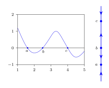 A line, usually vertical, represents an interval of the domain of the derivative. The critical points (i.e., roots of the derivative , points such that ) are indicated, and the intervals between the critical points have their signs indicated with arrows: an interval over which the derivative is positive has an arrow pointing in the positive direction along the line (up or right), and an interval over which the derivative is negative has an arrow pointing in the negative direction along the line (down or left). The phase line is identical in form to the line used in the first derivative test, other than being drawn vertically instead of horizontally, and the interpretation is virtually identical, with the same classification of critical points.